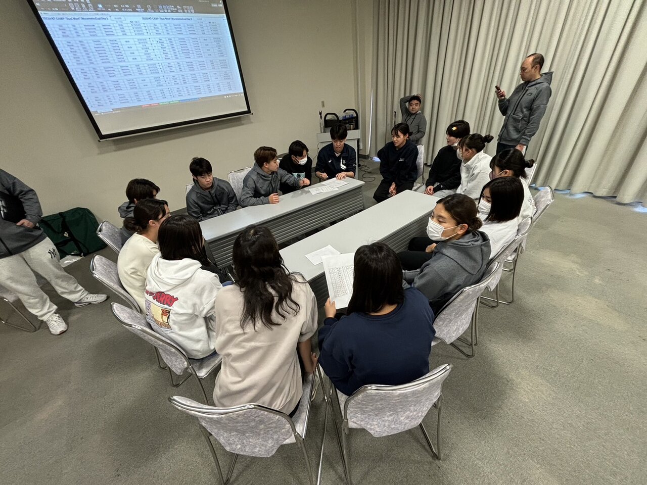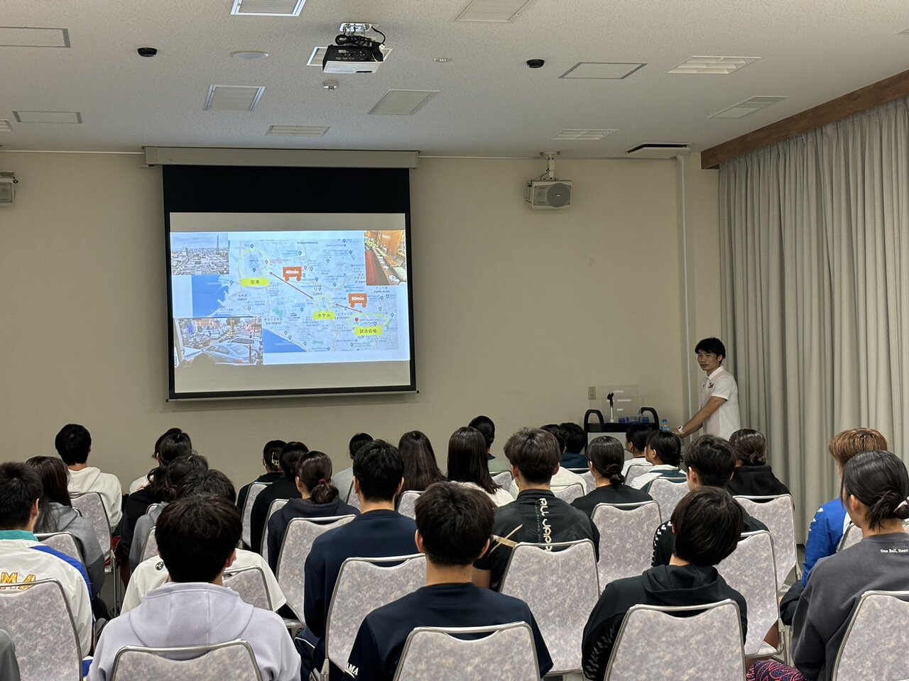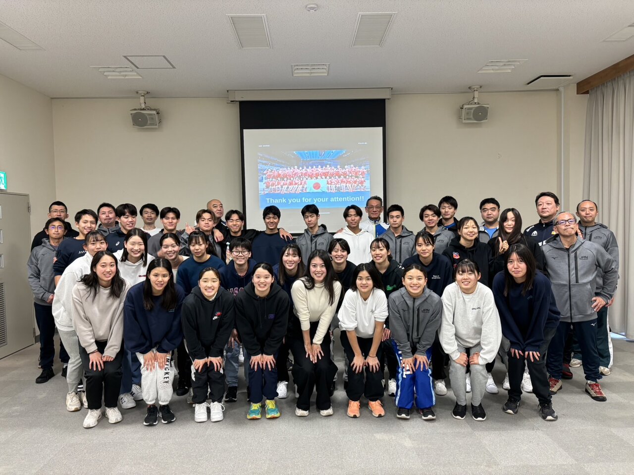 期間中は講習会もたくさん行われます。2日目は海外選手の大会期間中のウォーミングアップ・ダウンの取り組み方や、昨年のジュニアパンパシフィック選手権の大会の様子や海外で過ごす際の注意事項などについて世界大会を経験したコーチ・スタッフからお話しがありました。