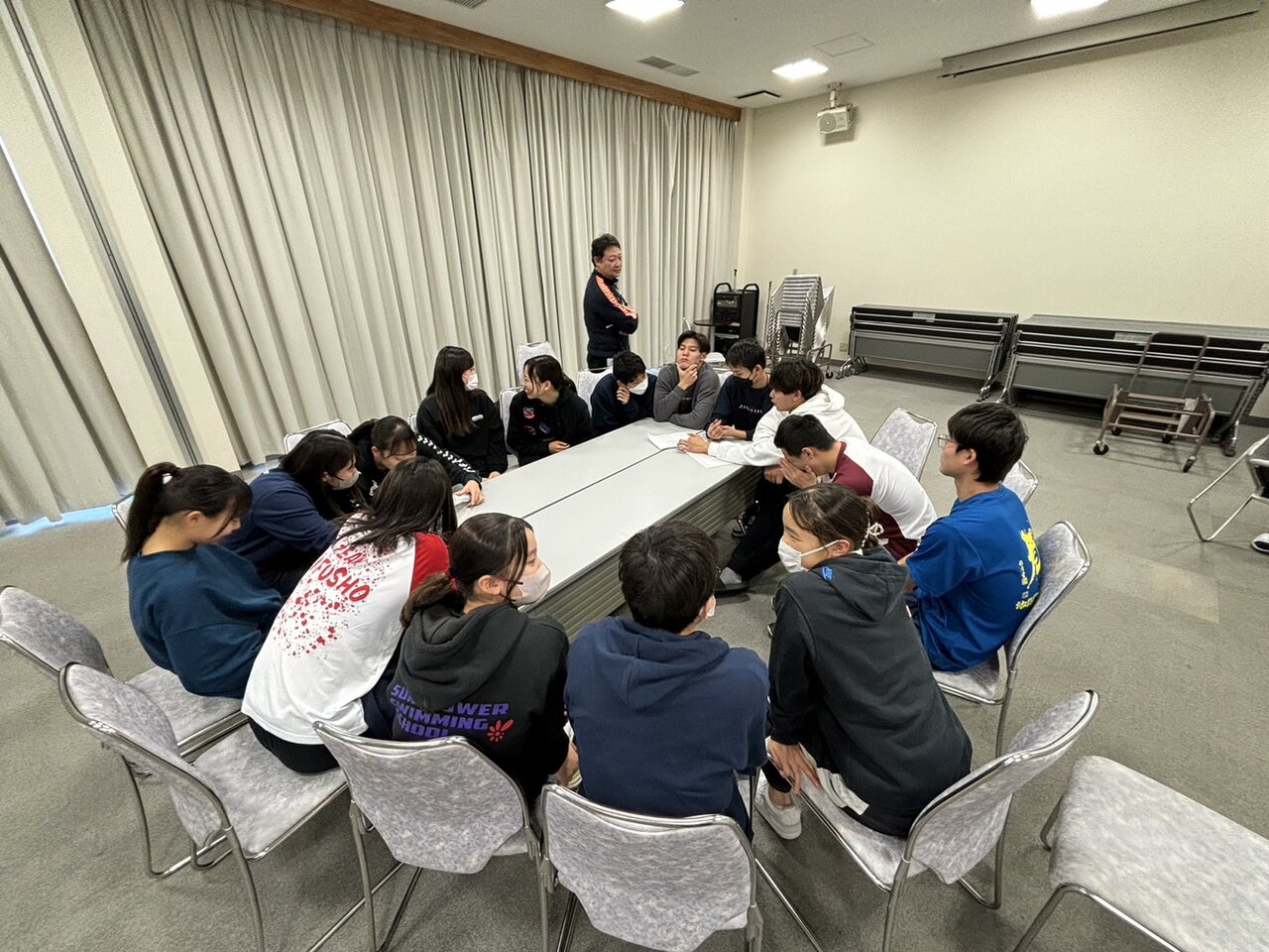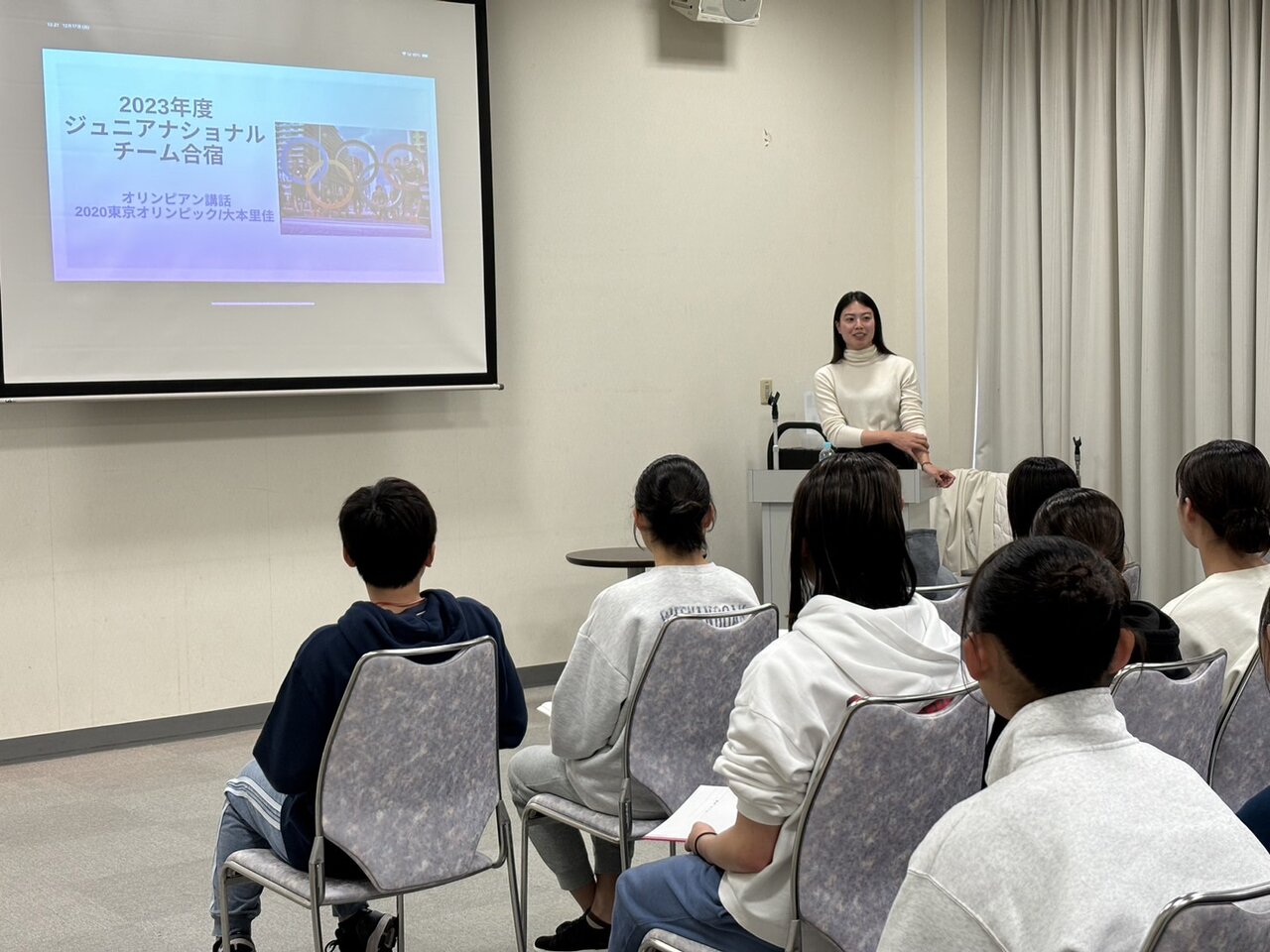 3日目はオリンピアンであり、今合宿コーチとして参加している糸井 統コーチからオリンピック経験談や裏話、ジュニアトップ選手として「勝ち続ける選手になるため」にどのような思考・意識をもち日々のトレーニングに取り組むことが大事なのかをわかりやすくお話ししてくださいました。