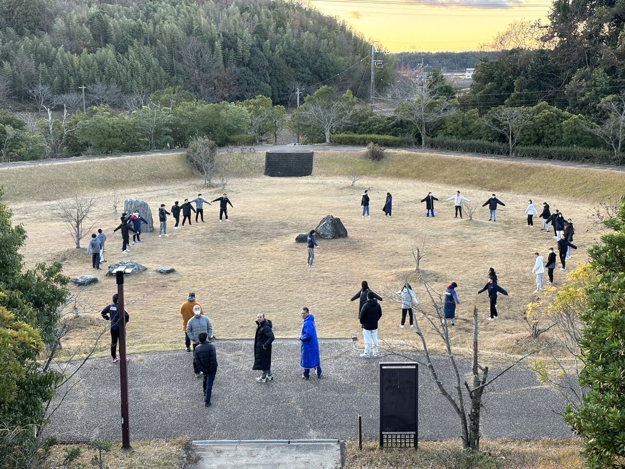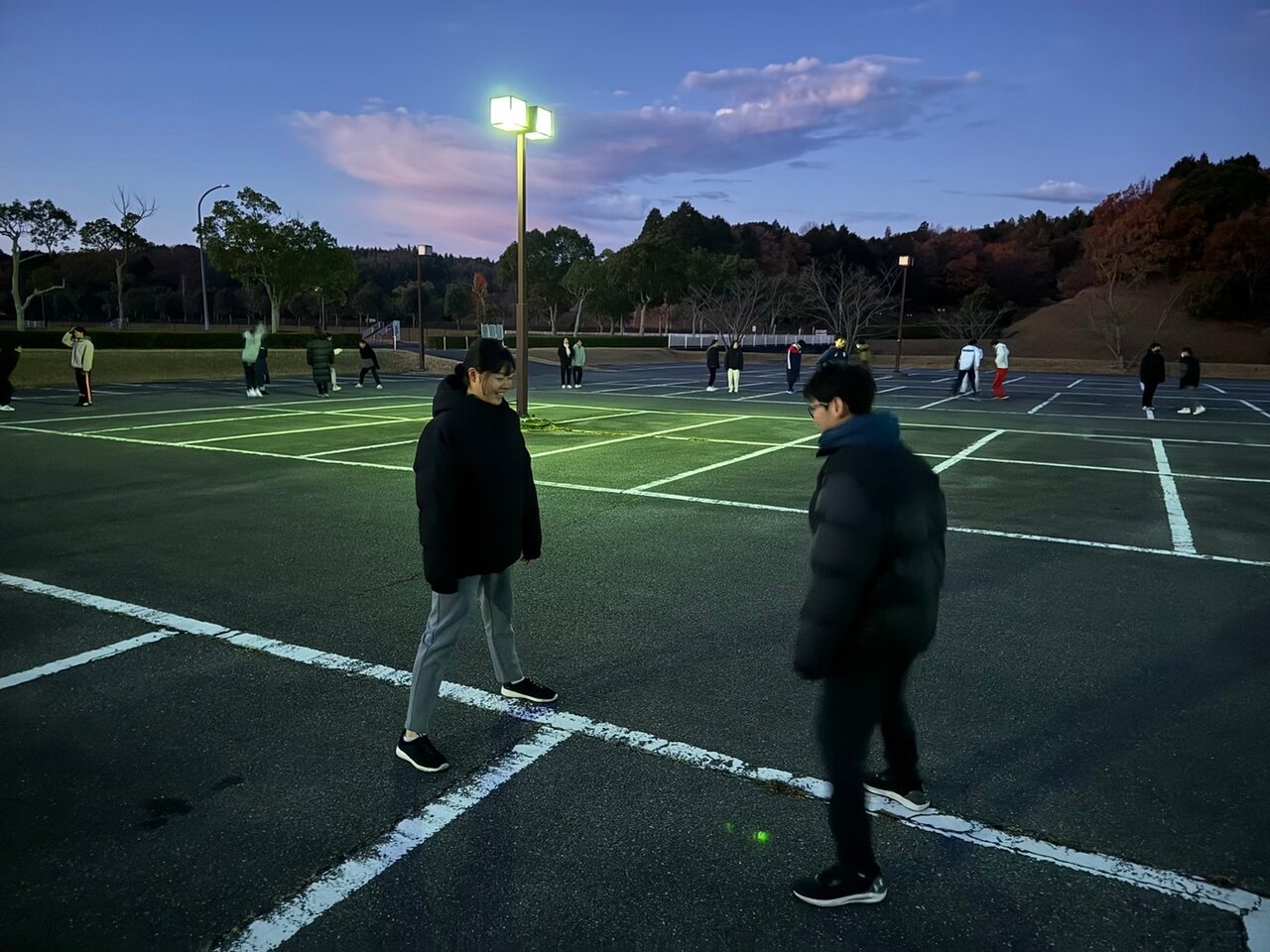 起床後は薄暗い中、宿舎内の駐車場で体操を行います。雨の日は室内で、OFF日の今日はゆっくり起床し近くの公園で体操しました。