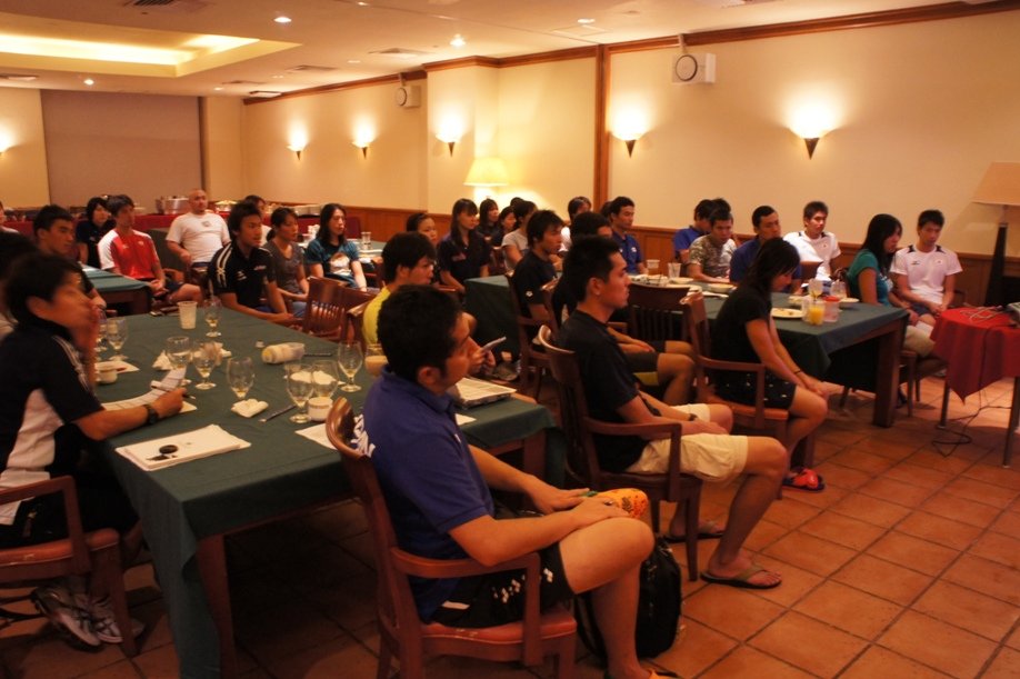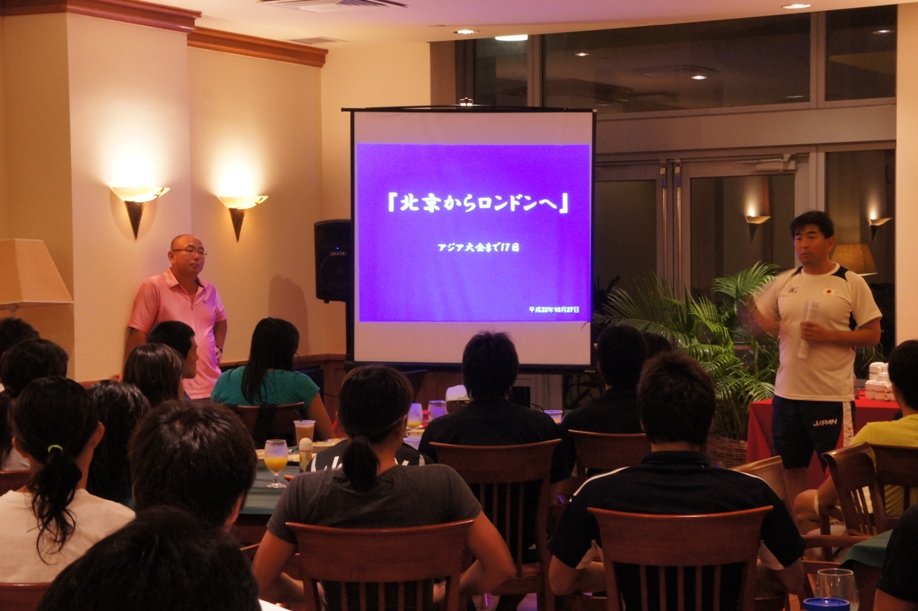 昨晩は、「北京からロンドンへ」というタイトルでミーティングを行いました。ロンドン五輪へ向けて中間年となる今年、まもなく始まるアジア大会は非常に重要になります。そのアジア大会での戦いに向けて、選手たちは上野競泳委員長から気合を注入されました。