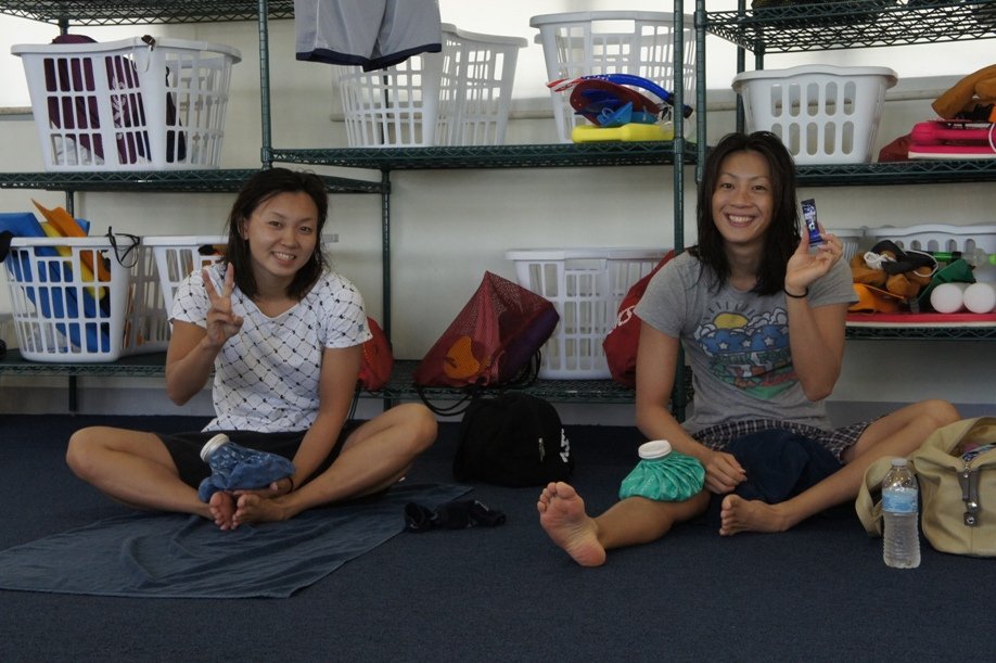 酒井選手(ブリヂストン)と星選手(スウィン大教)の大学2年生コンビ。こちらもトレーニング後のケアのひとつ、アイシングです。