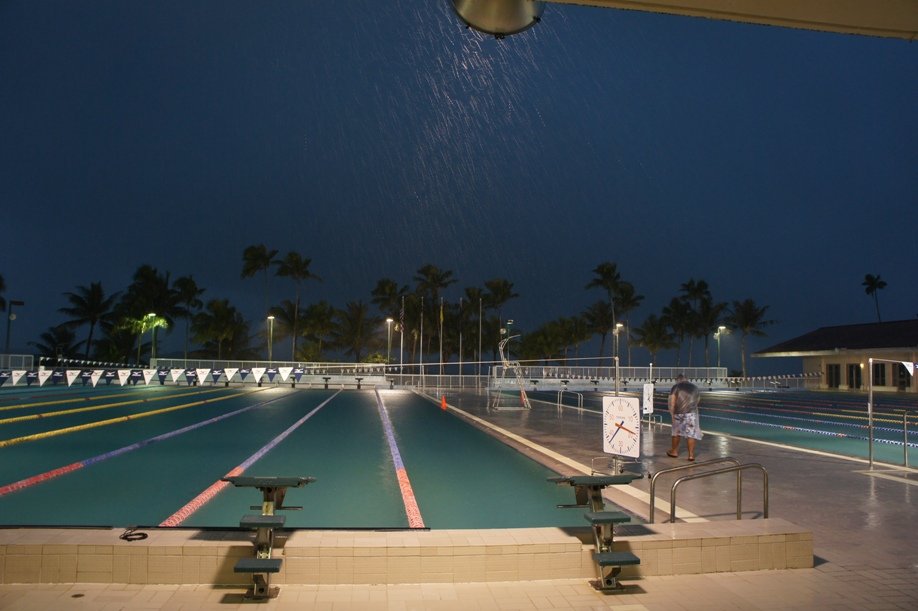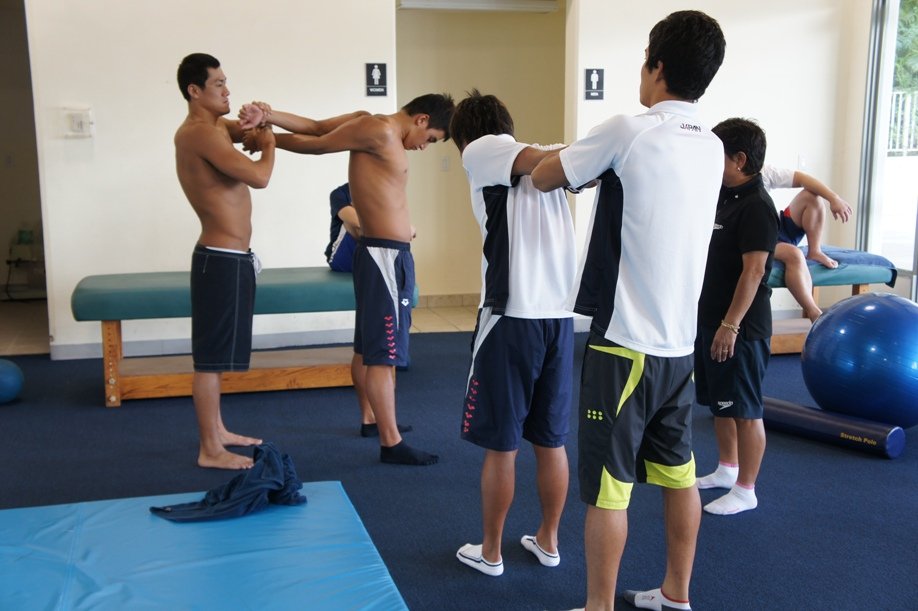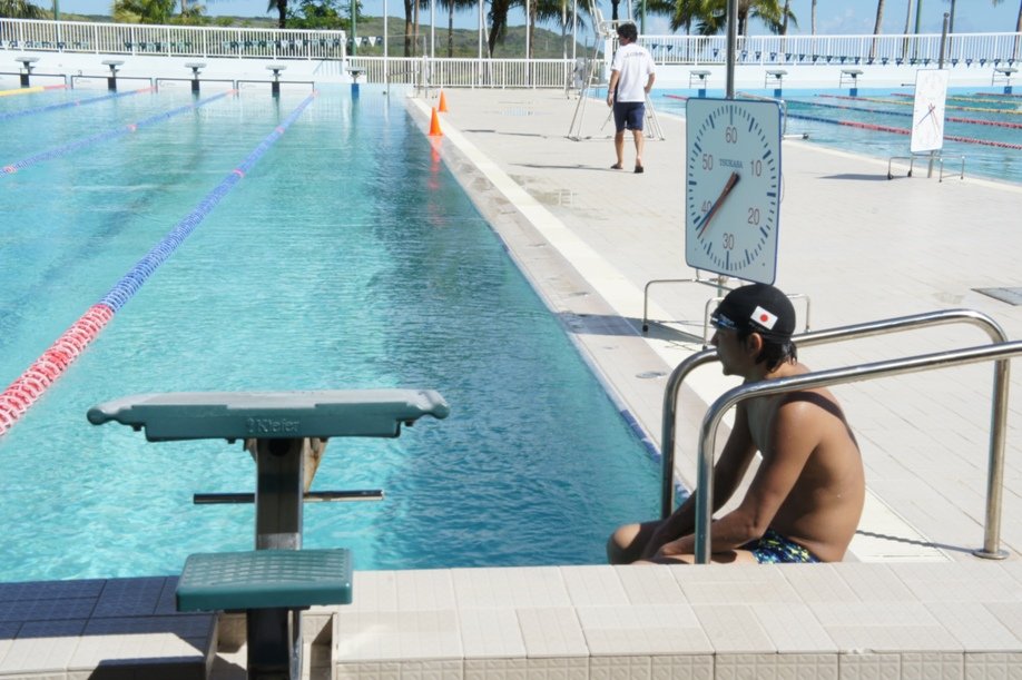 午前中は天気がよかったのですが、午後練習が終わる直前の激しい雨。屋外プールは開放感もあり、選手にとっては気分転換にもなります。ただ天候に左右されるところもあるので、体調管理は重要です。