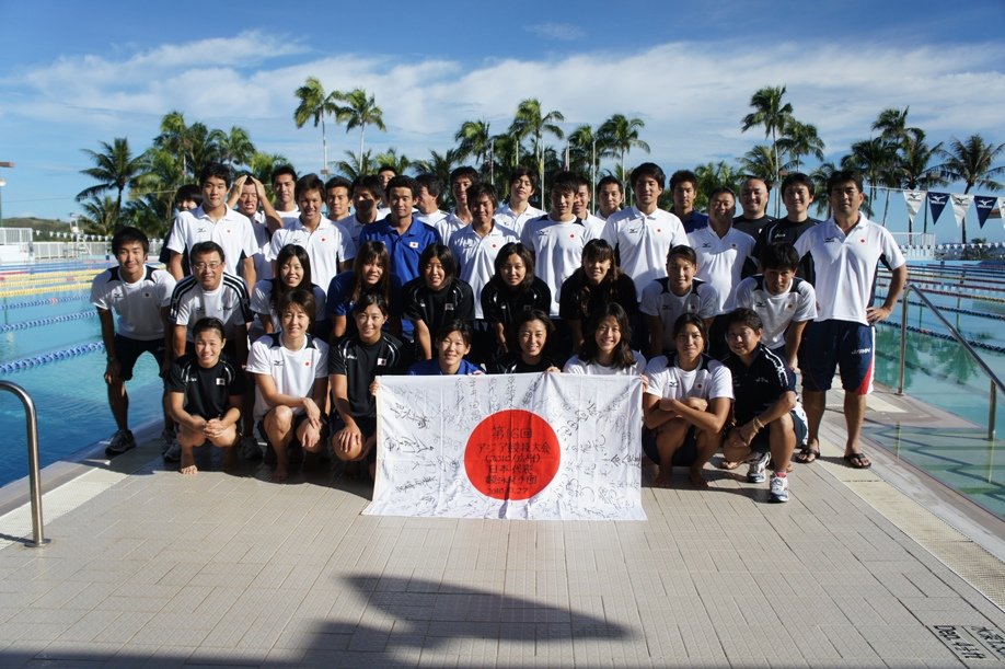 そして今日の最後は、今朝の撮りたて集合写真。このメンバー+米国でトレーニング中の北島選手・岸田選手・役員・サポートメンバーの方々でアジア大会を戦います!