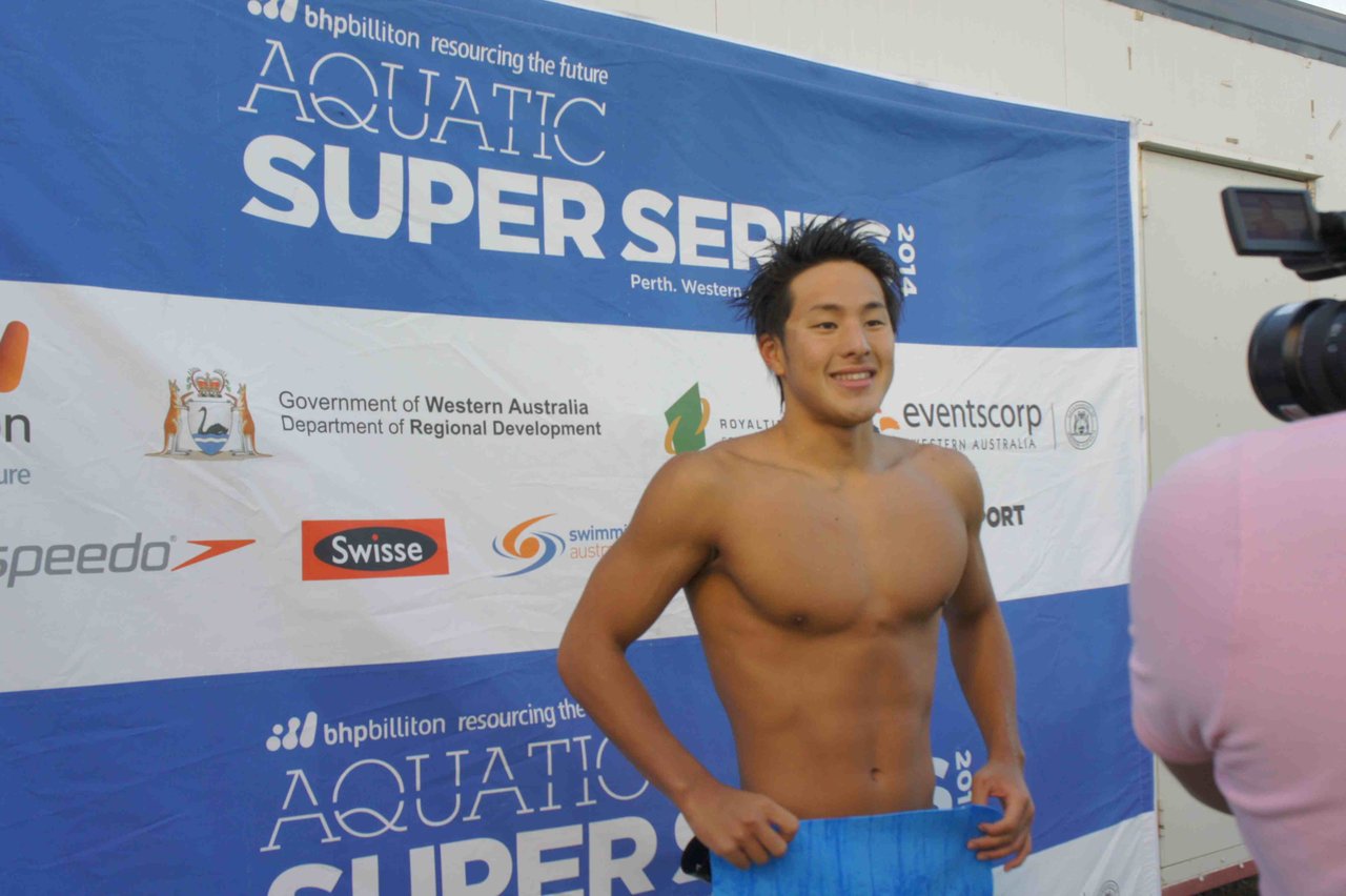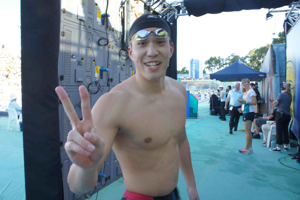 初日の本日はトビウオジャパンの男子チームが他国を圧倒。まずは100m平泳ぎで小関也朱篤選手(日本体育大学)が59秒94の好記録で世界水泳バルセロナ金メダリストのChristian Sprenger選手(豪州)を破り優勝!