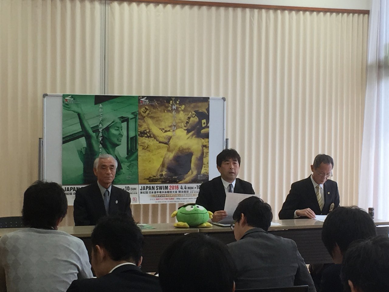 本日は岸記念体育会館内にて青木剛会長、鈴木浩二大会実行委員長、平井伯昌競泳委員長による報道陣向け大会予想会が行われました。
