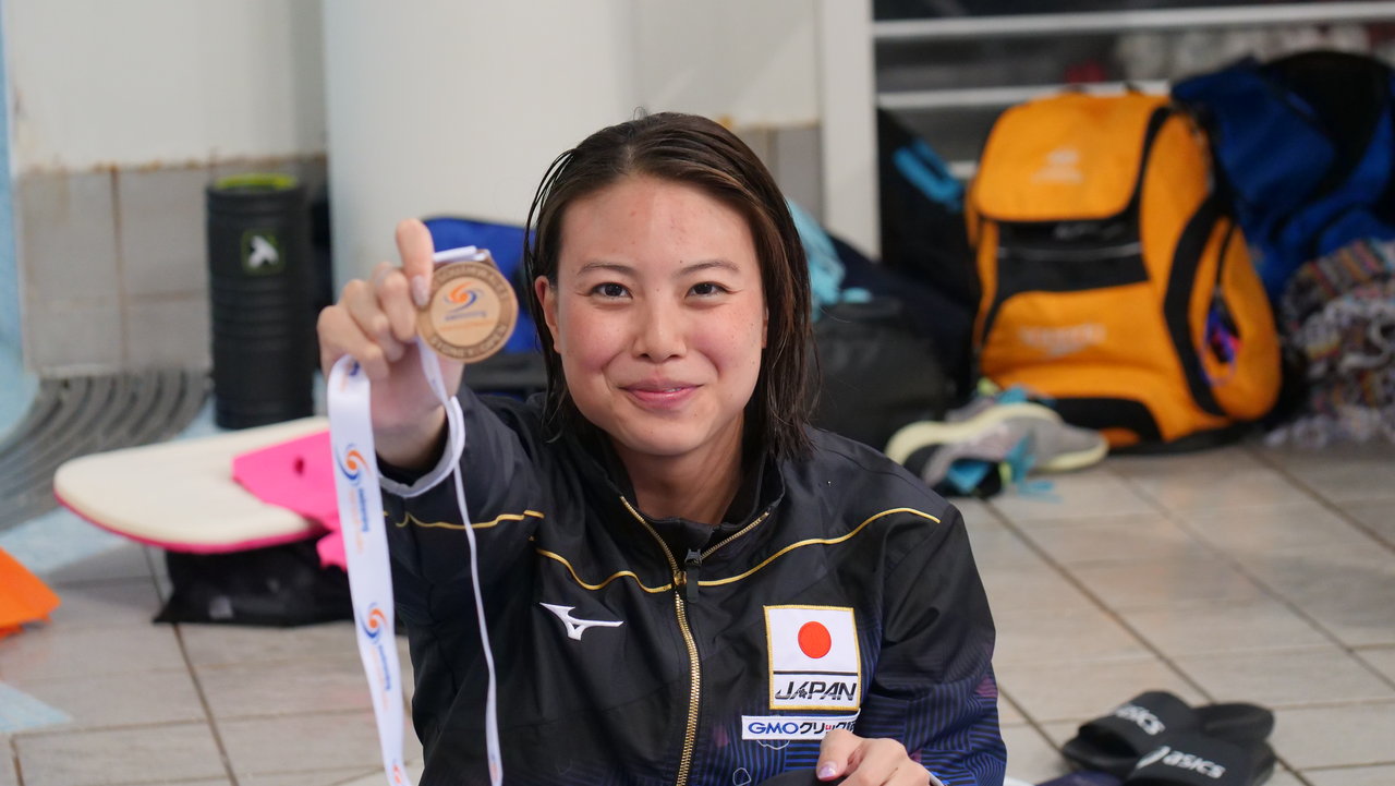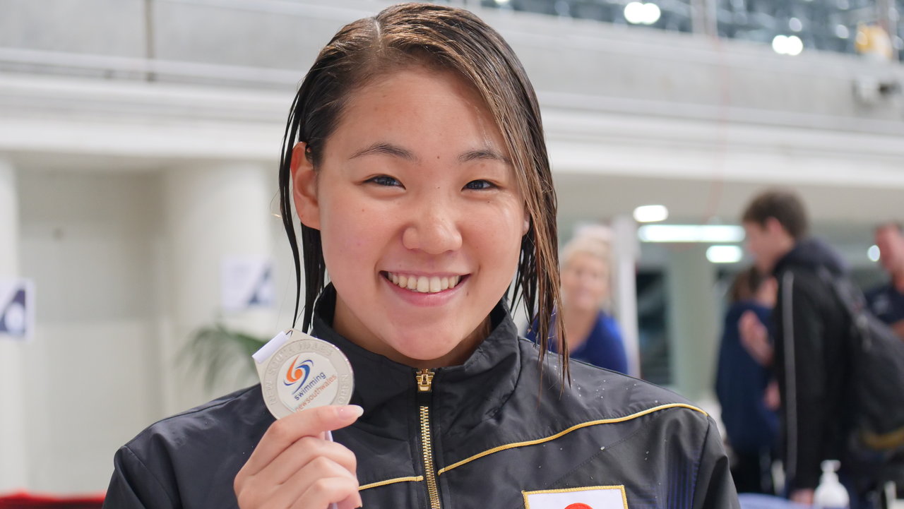 女子100m背泳ぎは酒井夏海選手を抑えて、小西杏奈選手(ガスワン/サイサン)が1分00秒91の1位で決勝に進出。酒井選手は1分00秒95ですぐ後に続いています。
