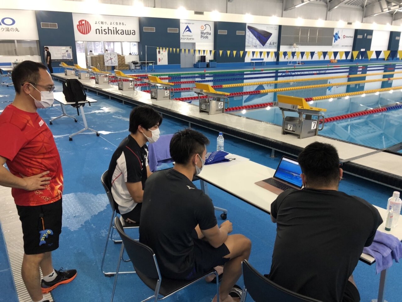 下山グループは映像をみて、水沼選手を中心に泳法研究をしていました。