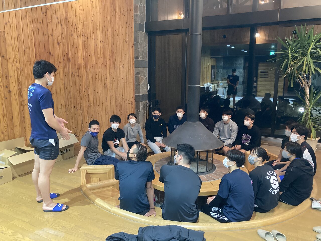 合宿中は宿舎の暖炉を囲み、チームミーティングを行なっています。1人ずつの自己紹介を始め、水泳に対する想いや東京オリンピック代表者は出場した感想をみんなの前で話しました。