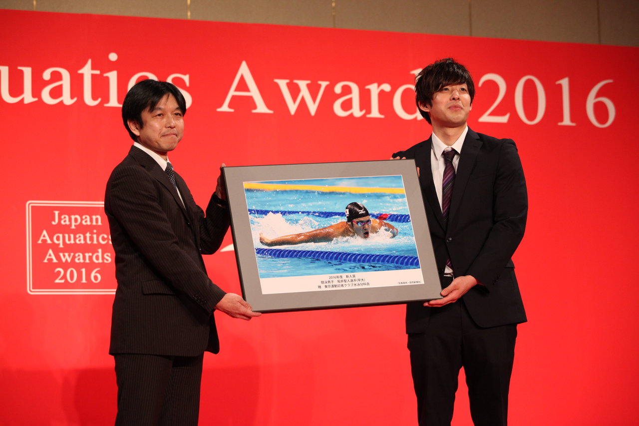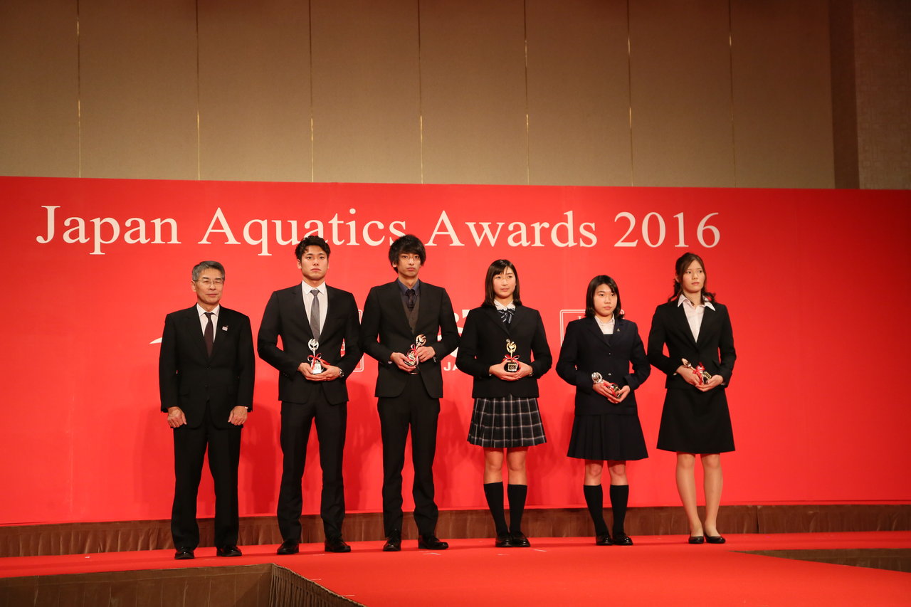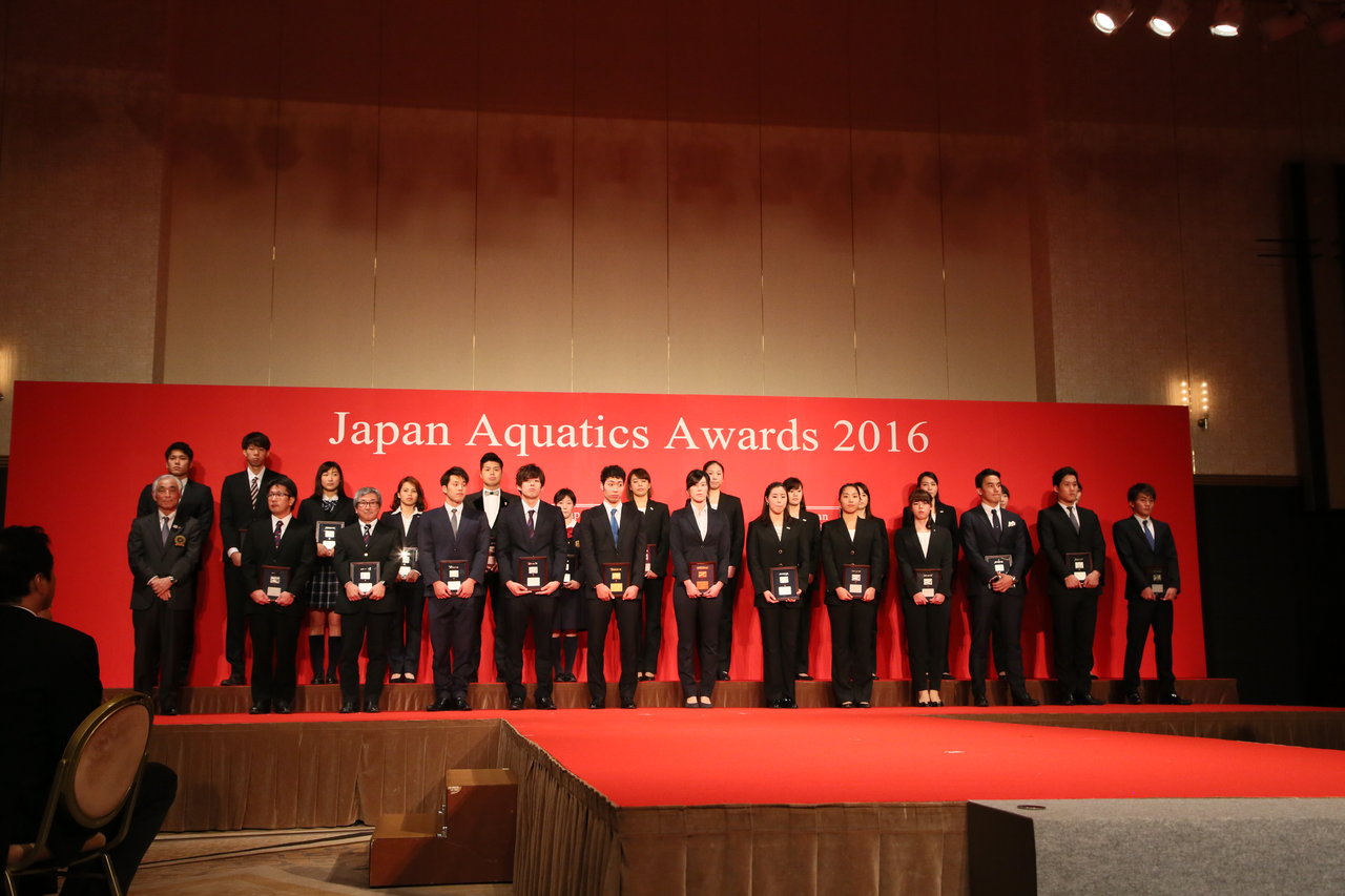 日本水泳連盟そして水泳5競技(競泳、シンクロ、水球、飛込、OWS)の発展を日頃より支えて下さっているスポンサーの皆様、メディアの皆様への感謝の意をお伝えするとともに、2016年に活躍した選手たちの表彰式も行われました。