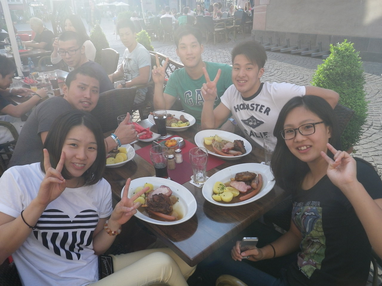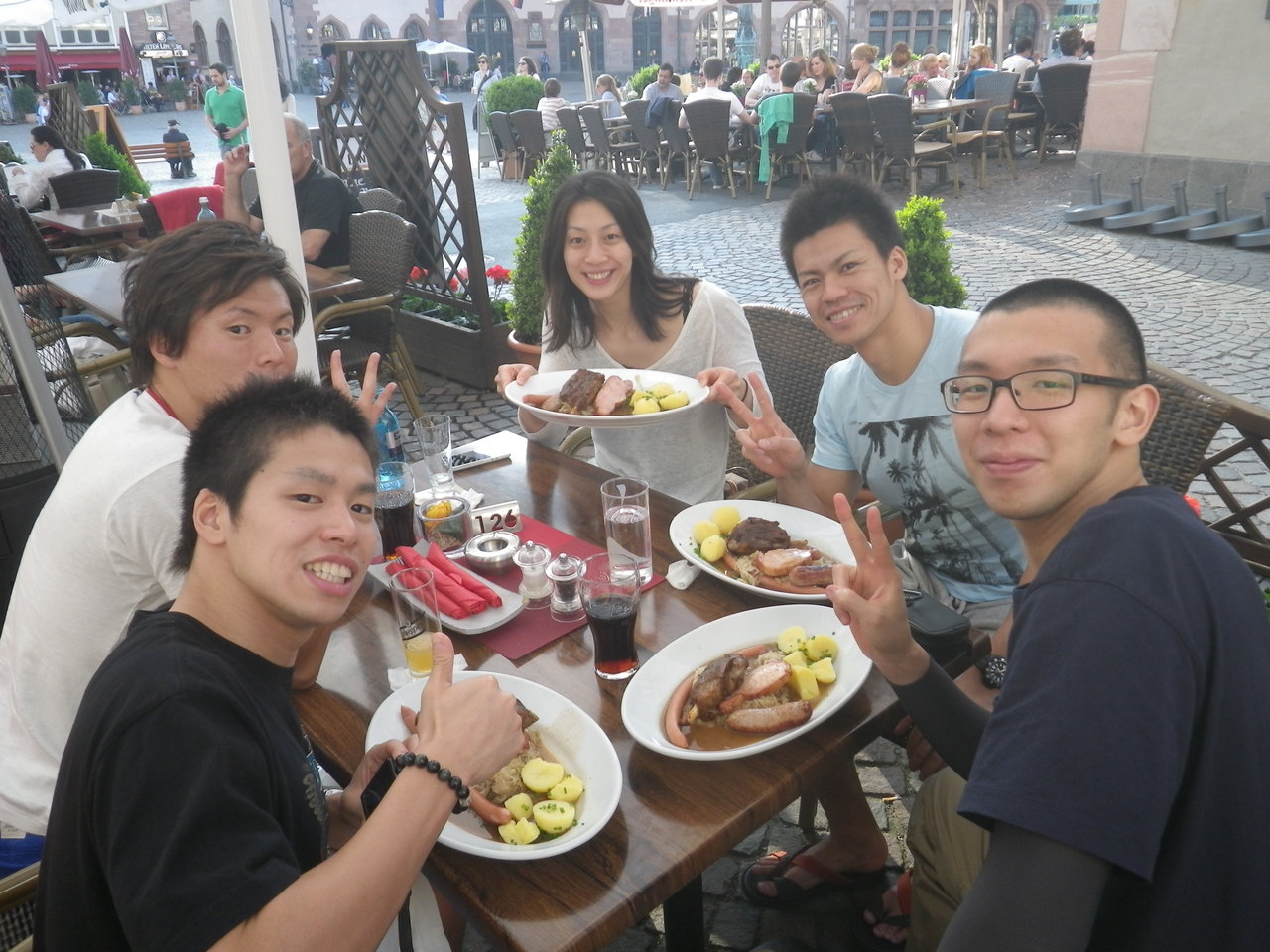 フランクフルトで乗り継ぎの待ち時間があったので、選手全員で食事。